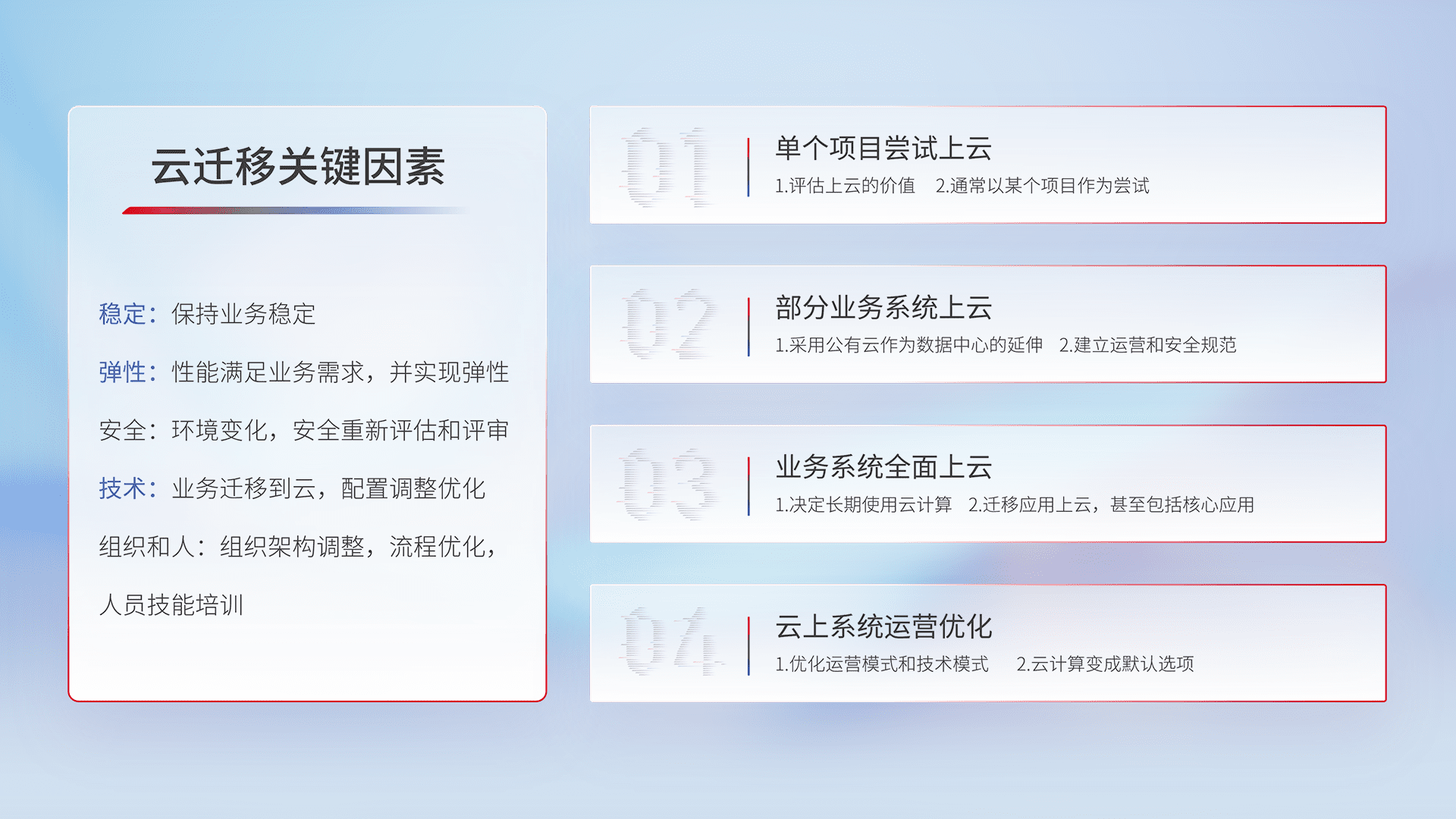 结合实际业务,,从规划设计、、、、云平台选型、、、云原生改造、、、、数据迁移、、、、集成交付,,,,迁移全过程为客户识别最佳上云路径,,做好风险识别管理,,,,设计网络架构、、、、身份权限、、、、安全审计合规、、、、操作审计、、日志审计、、监控告警策略、、多站点容灾设计等,,,,对云上基础设施进行整体规划,,,提升IT治理水平,,,,以满足弹性、、、、高可用、、、、高性能的需求。。。。