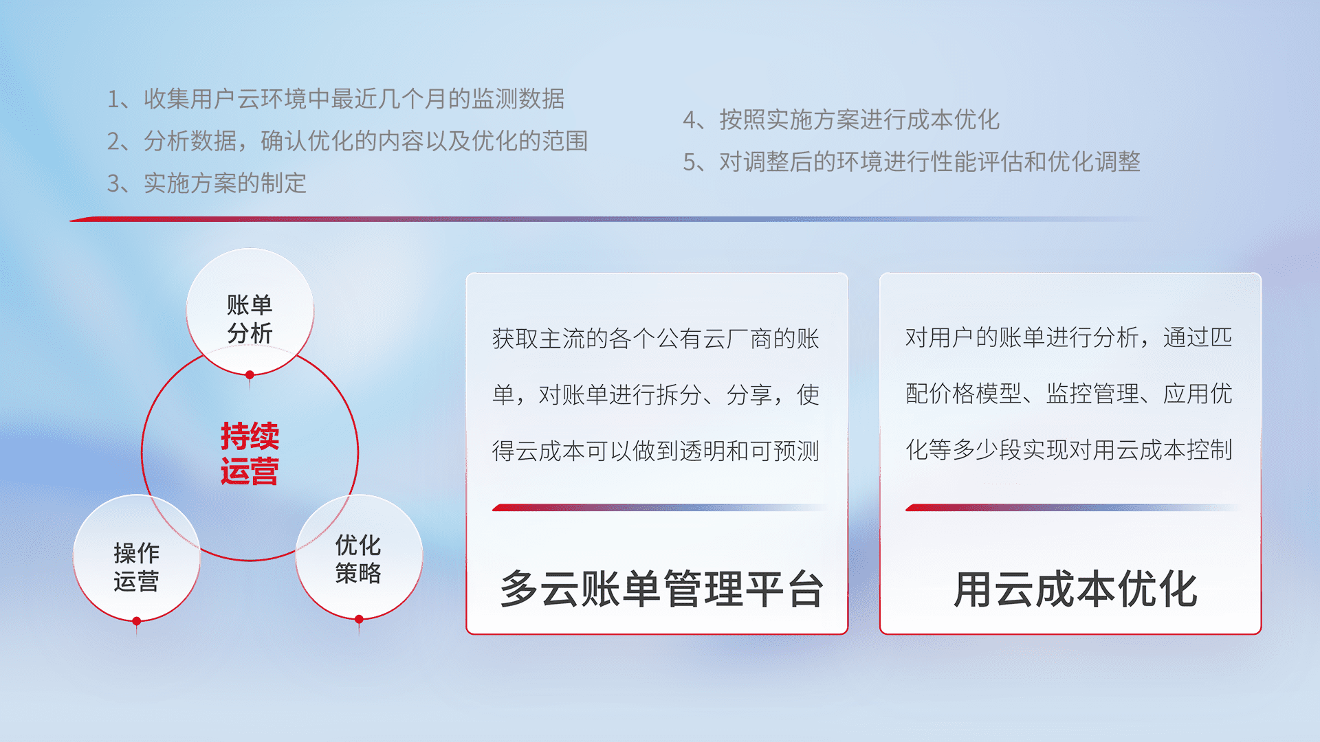 通过多云纳管,,,,以统一的资源数据模型把客户的云资源进行抽象和封装,,,进而实现对多云资源的统一操作,,保障云资源管理的可靠性、、、稳定性与可用性。。。。量身定制化运维内容,,,,配置、、、、开发运维、、、补丁管理、、、、备份、、监控、、、认证和访问管理、、审计和日常巡检等,,保障在用云过程中的可靠度,,稳定度以及高可用率。。。